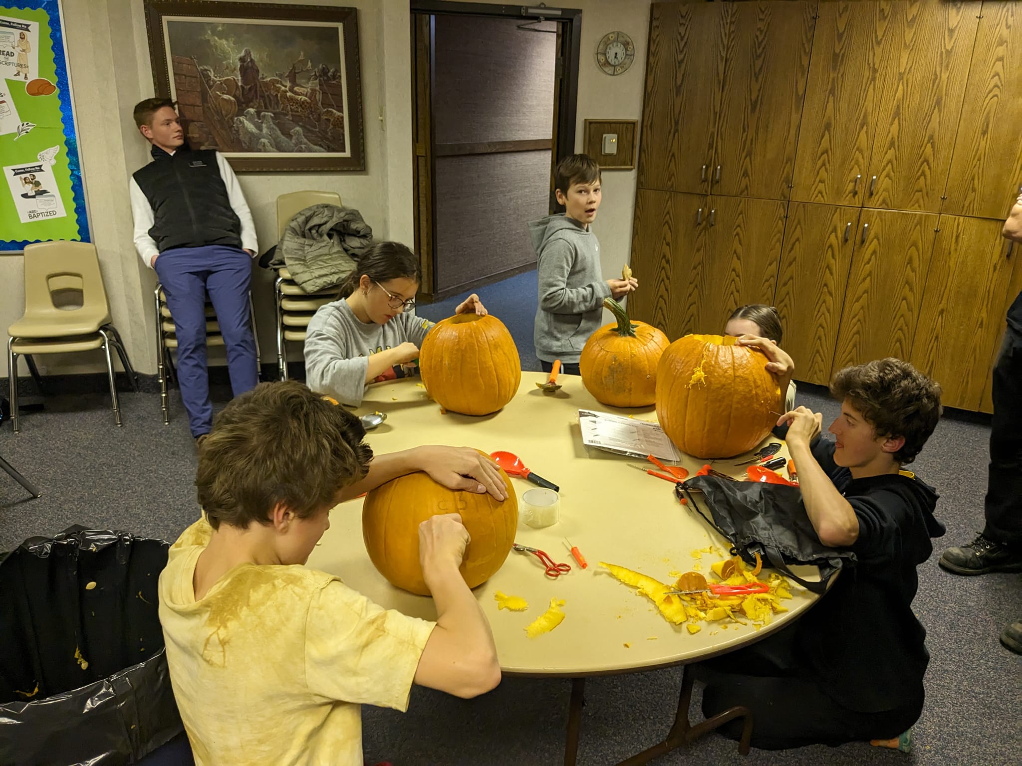 This year, the Young Men/Young Women carved pumpkins during one of their actvities. Julia was too sick that day, so she carved hers with Ryan. Kelden wasn't done and Zack helped too.